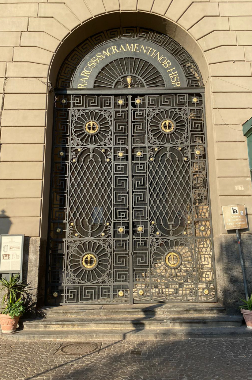 The entrance gate to the church of San Giacomo degli Spagnoli, the object of this restoration, is located at the main facade of the Palazzo San Giacomo which is the town hall of the city housing the Mayor’s office.