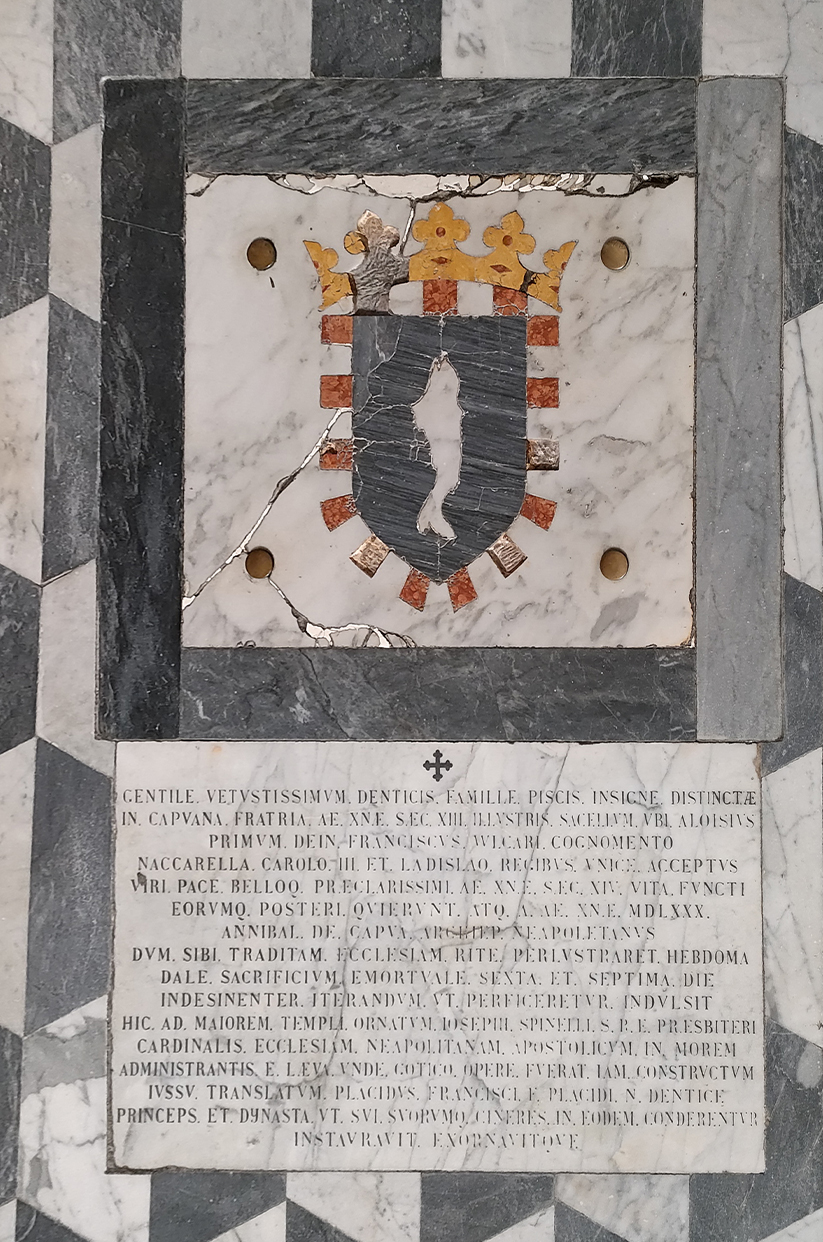 The tombstone was located in front of the chapel of the Dentice family, dedicated to the “Annunziata” Virgin Mary, and was abolished during the restoration of the Cathedral promoted by Cardinal Filippo Giudice Caracciolo, archbishop of Naples between 1833-44.