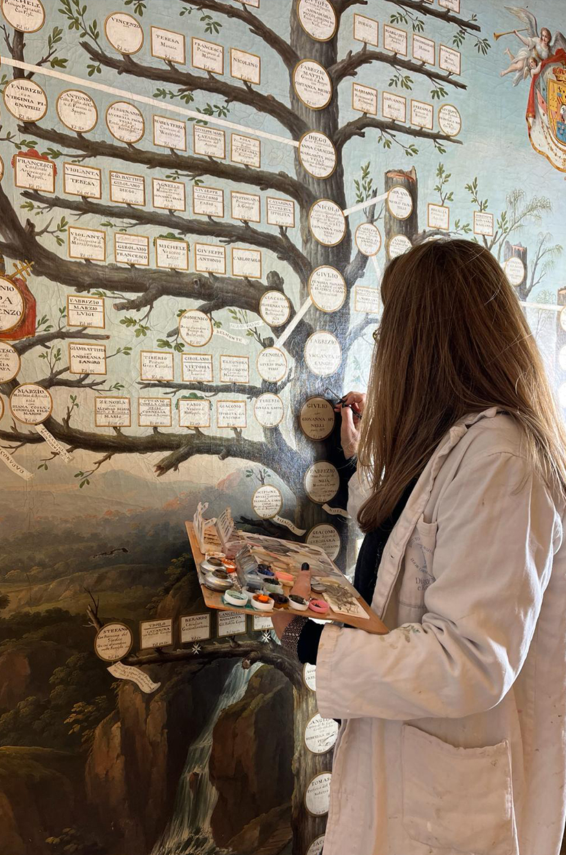 Collaborations and partnerships: Studio ERMES by Iriana Suprina Petrovic – Matteo Rossi Doria of the CBC – Emmebi Diagnostica ArtisticaThe Family Tree of the Pignatelli Aragona family is a painting of considerable size (300×160 cm) from the mid-19th century, kept at the Diego Aragona Pignatelli Cortes Museum, better known as Villa Pignatelli.